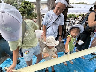 流しソーメンが初体験のちびっこたちもいて、皆夢中で慣れない「流れてくるソーメン」と格闘。