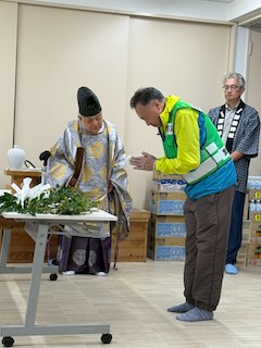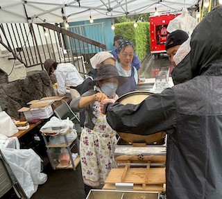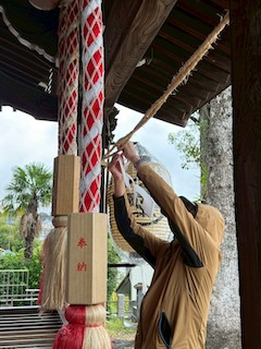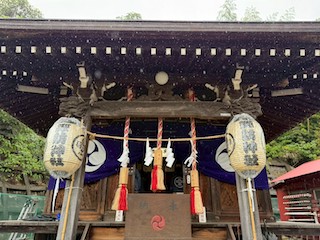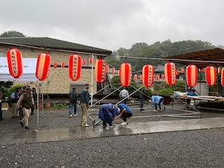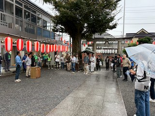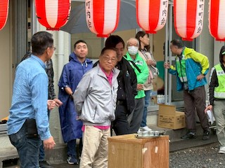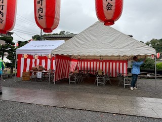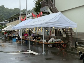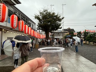ところが、当日は無常にも雨が止まないままスタート!神事ですからお天気に関係なく、雨でもやるには変わらない。9:00にスタッフ全員集合して、まずは2日間の無事の開催と皆様の安全を祈願して「御神酒」で乾杯!!