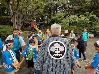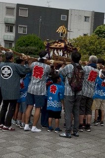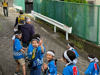 箕輪諏訪下第二公園で、先に着いていた山車と合流。 山車を引っ張ってくれた小学生は神輿に移動。